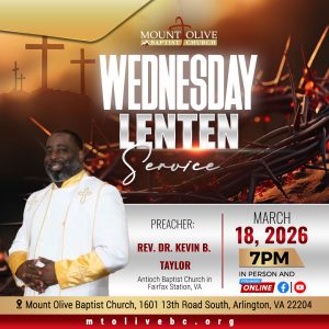 Lenten Wednesday Service Lenten Service at 7 p.m. at Mount Olive Baptist Church ... 25 Feb 7:00 PM Mount Olive Baptist ChurchMount Olive Baptist Church, 1601 13th Rd S, Arlington, VA 22204, USA